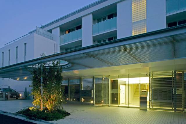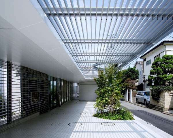 ホワイトのタイルとエントランスのルーバーが印象的な外観