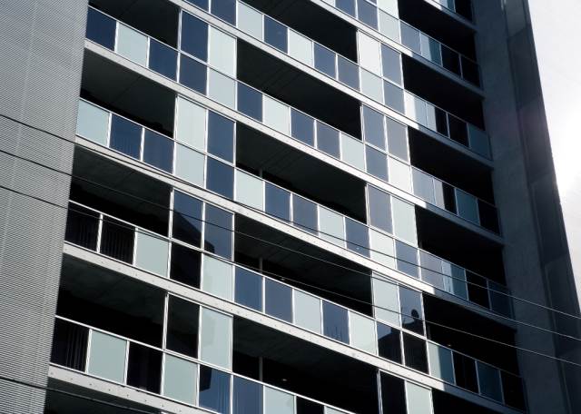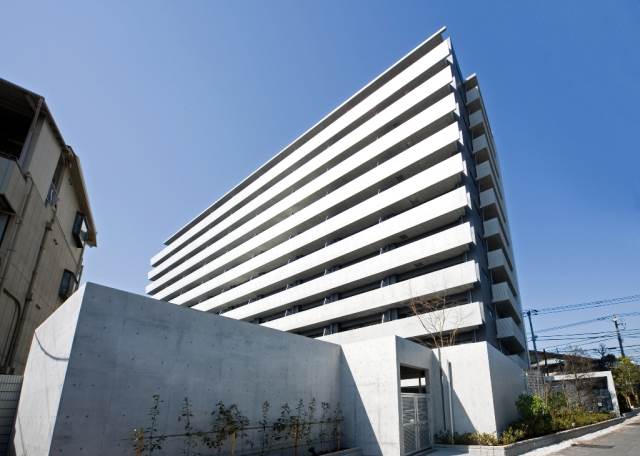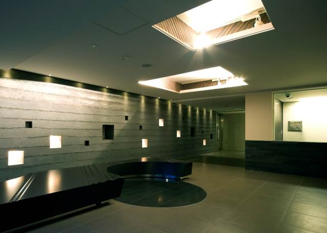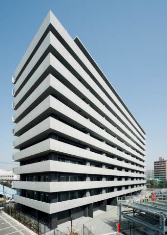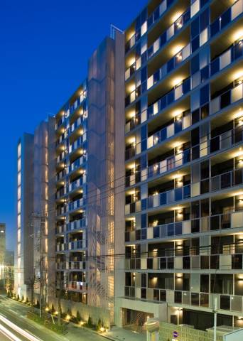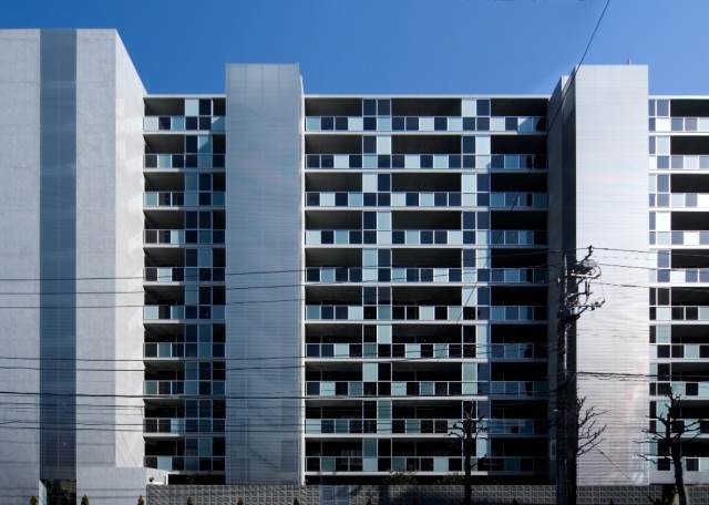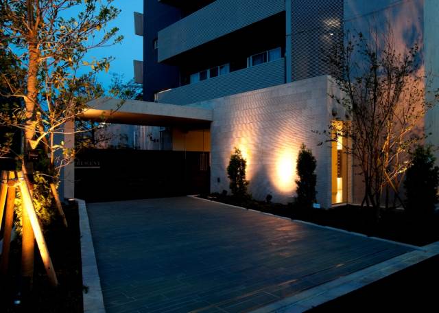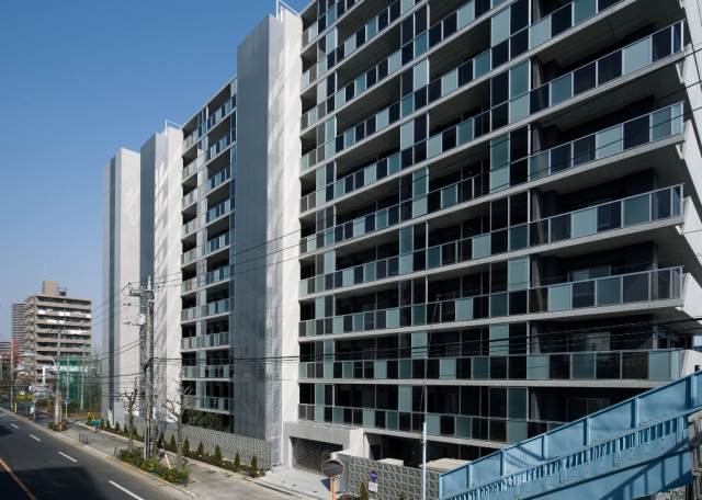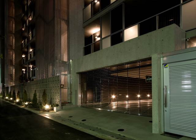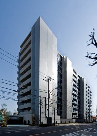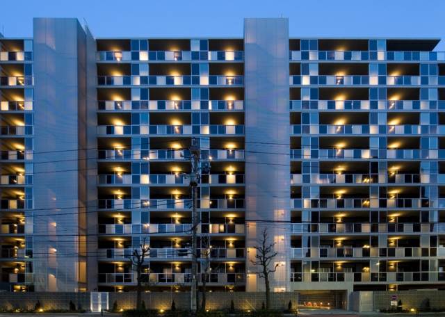 ガラス×金属×コンクリートを巧妙にマッチングさせ、かつ表裏のファサードにそれぞれ違う表情を、ライティングにもこだわり、夜の表情もまた印象的。船堀駅より徒歩8分の全93邸。