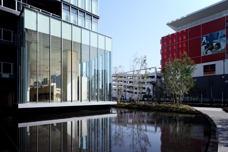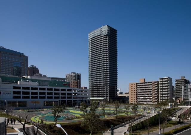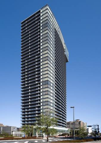 ラゾーナ川崎プラザ隣接、ガラス張りの伸びやかなファサードが印象的な38階建、365戸の免震タワーレジデンス。2009年グッドデザイン賞受賞プロジェクト。